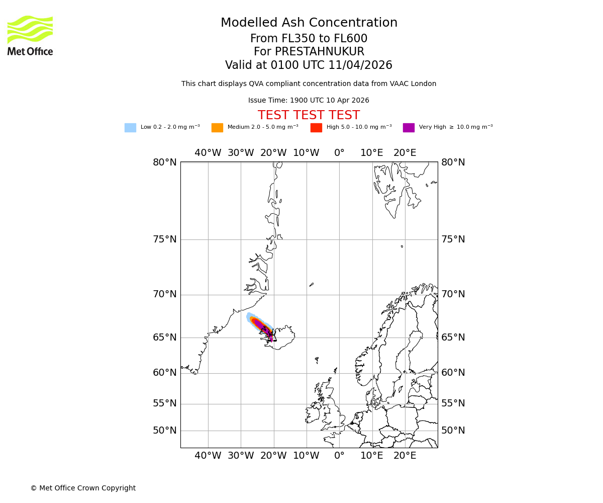 Modelled ash concentration from 350 to 600 for PRESTAHNUKUR. Valid at 1900 UTC 10/04/2026