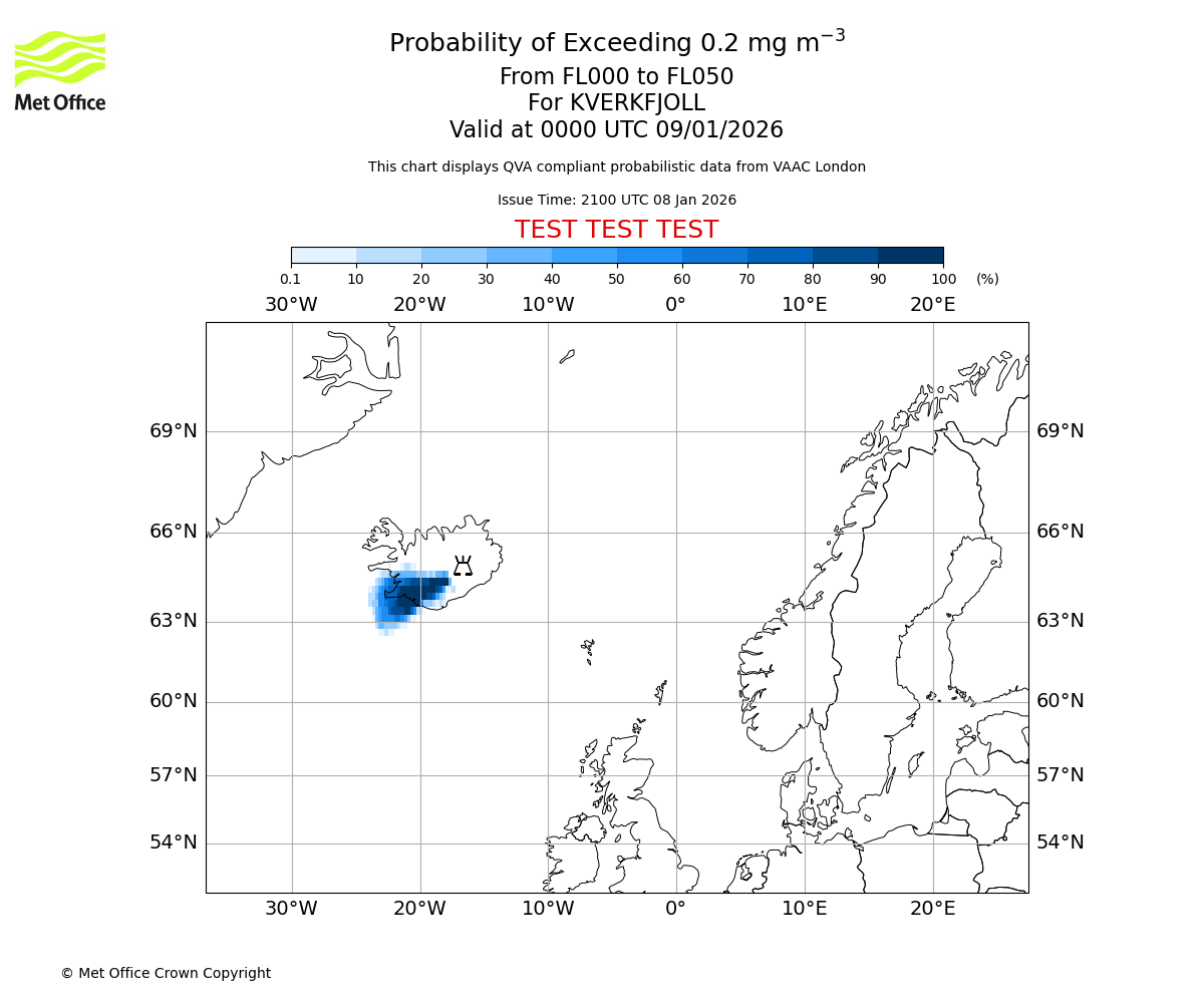 Modelled ash concentration from 000 to 050 for KVERKFJOLL. Valid at 2100 UTC 08/01/2026