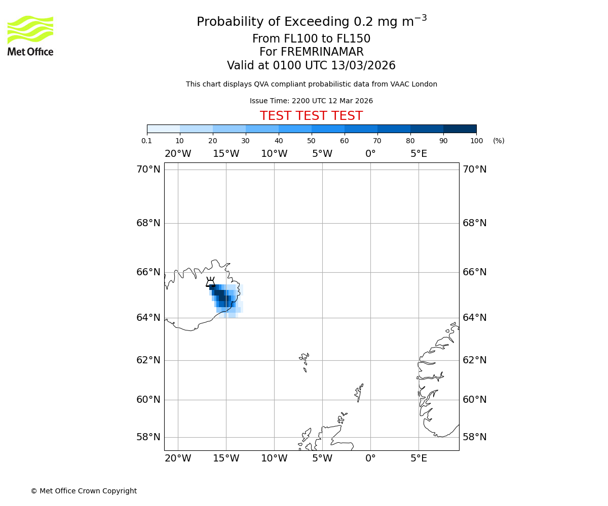 Modelled ash concentration from 000 to 200 for FREMRINAMAR. Valid at 2200 UTC 12/03/2026