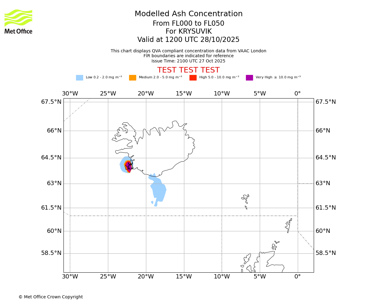 Modelled ash concentration from 000 to 200 for KRYSUVIK. Valid at 2100 UTC 27/10/2025