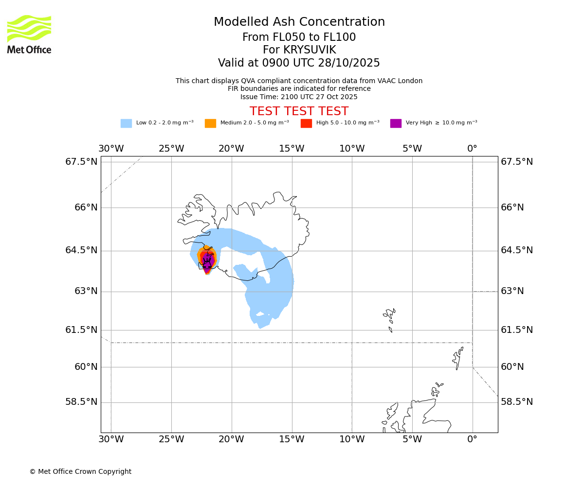 Modelled ash concentration from 000 to 050 for KRYSUVIK. Valid at 0900 UTC 28/10/2025