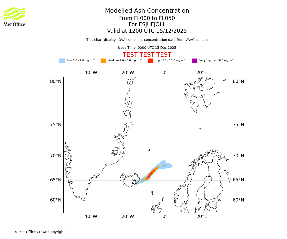 Modelled ash concentration from 000 to 200 for ESJUFJOLL. Valid at 0000 UTC 15/12/2025