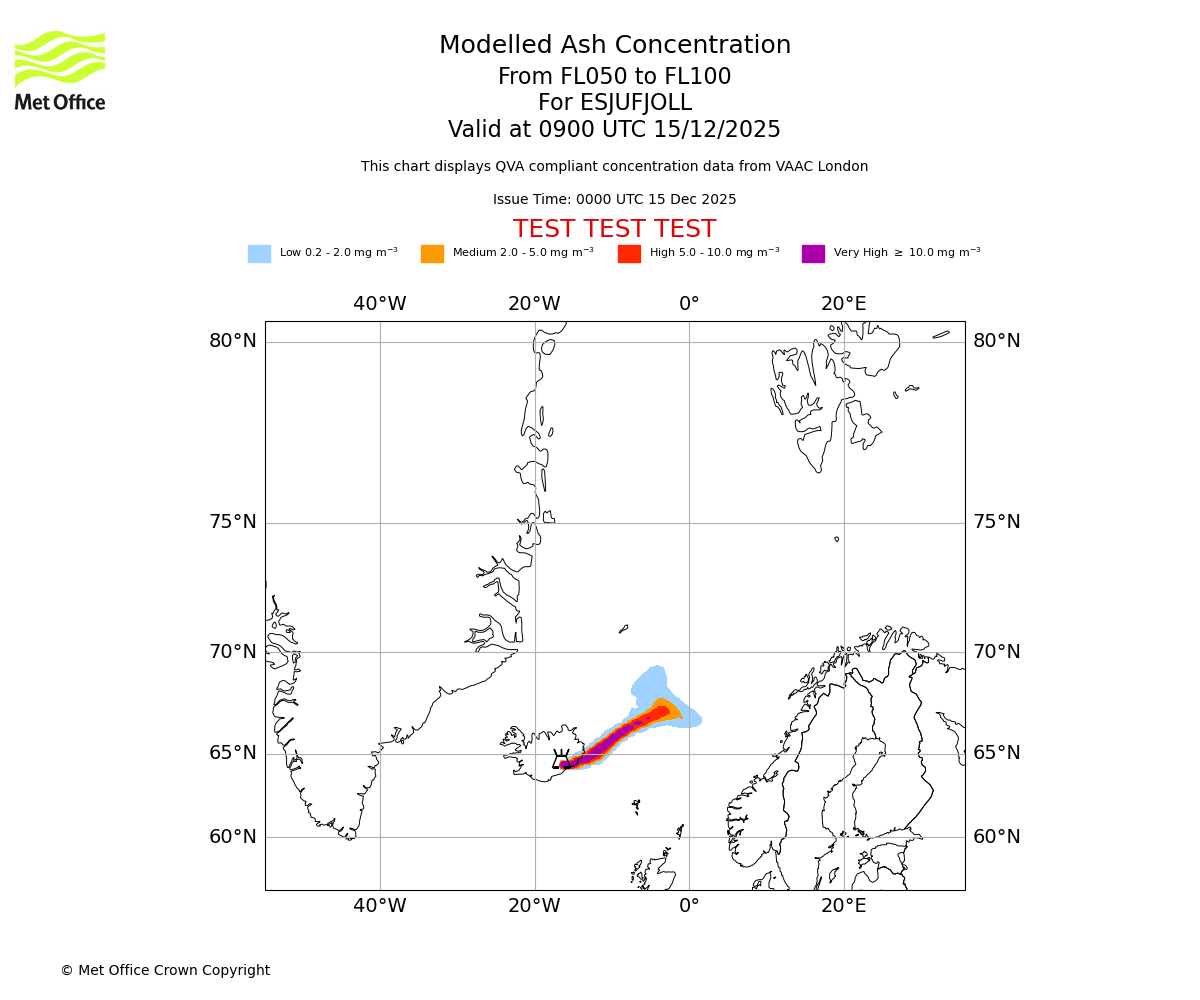 Modelled ash concentration from 000 to 050 for ESJUFJOLL. Valid at 0900 UTC 15/12/2025