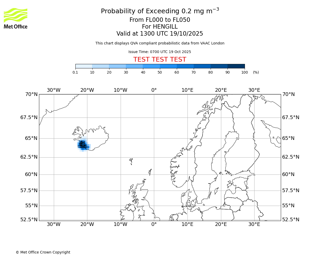 Modelled ash concentration from 000 to 200 for HENGILL. Valid at 1300 UTC 19/10/2025