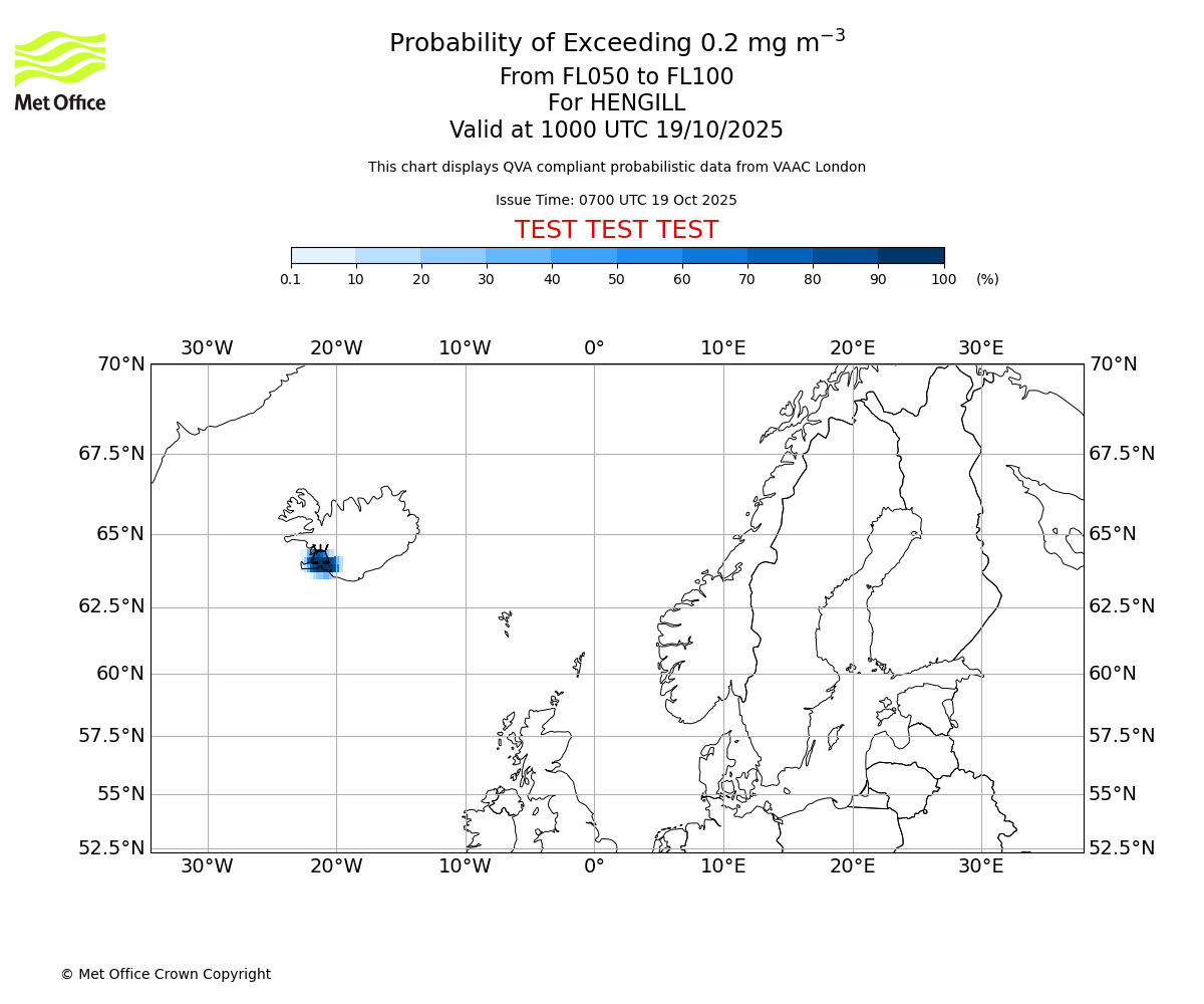 Probability of exceeding 0.2 milligrams per metre cubed. From 000 to 050 for HENGILL. Valid at 1000 UTC 19/10/2025
