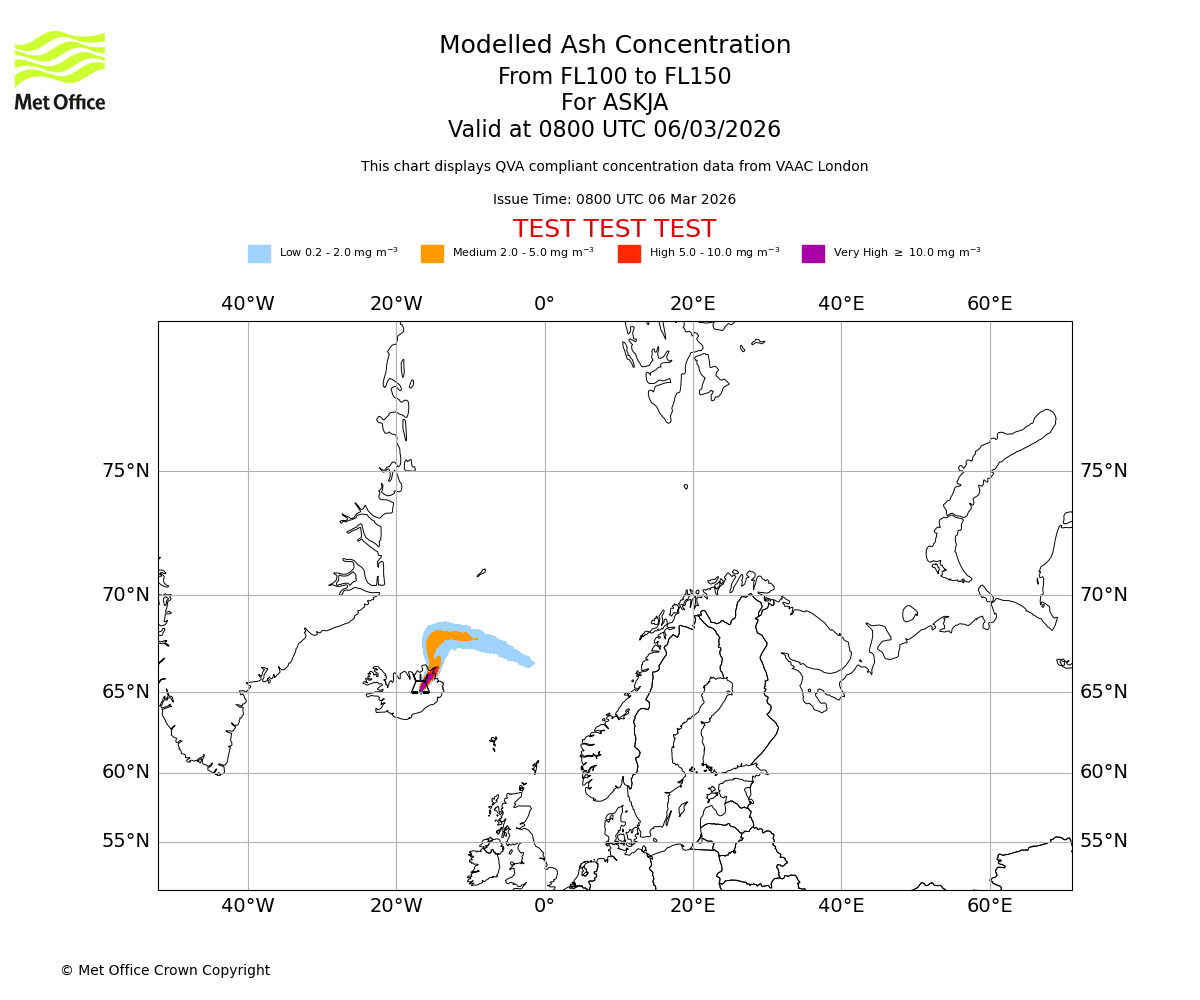 Modelled ash concentration from 050 to 100 for ASKJA. Valid at 0800 UTC 06/03/2026