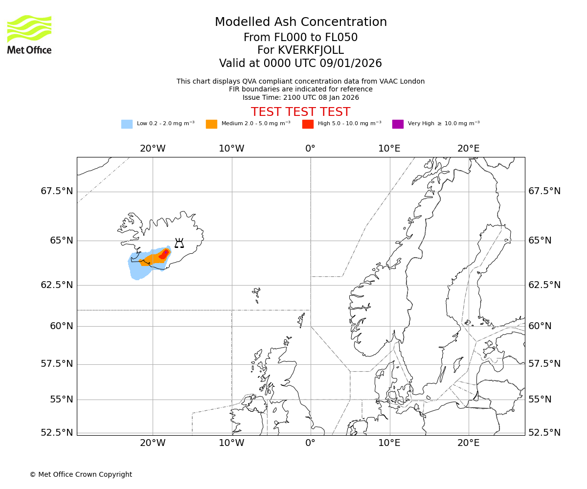 Modelled ash concentration from 000 to 050 for KVERKFJOLL. Valid at 2100 UTC 08/01/2026