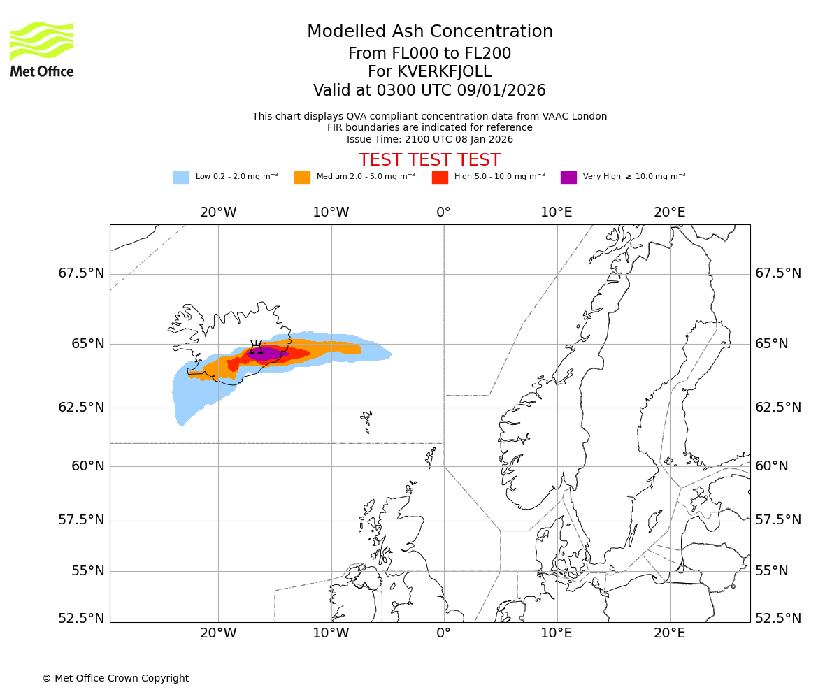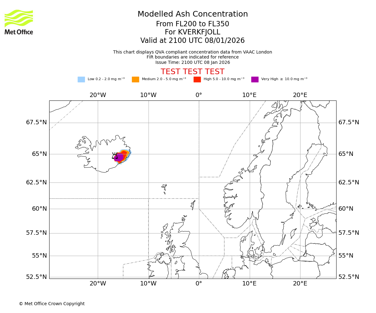 Modelled ash concentration from 000 to 200 for KVERKFJOLL. Valid at 2100 UTC 08/01/2026