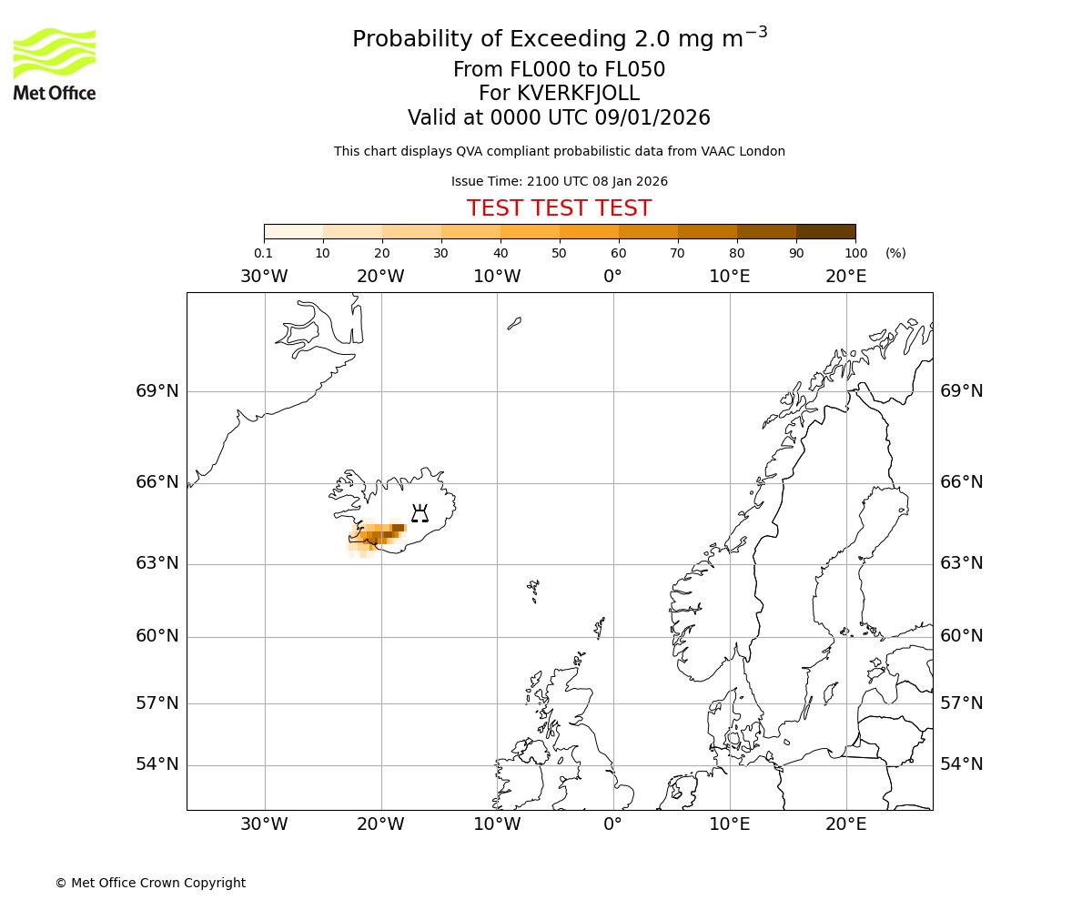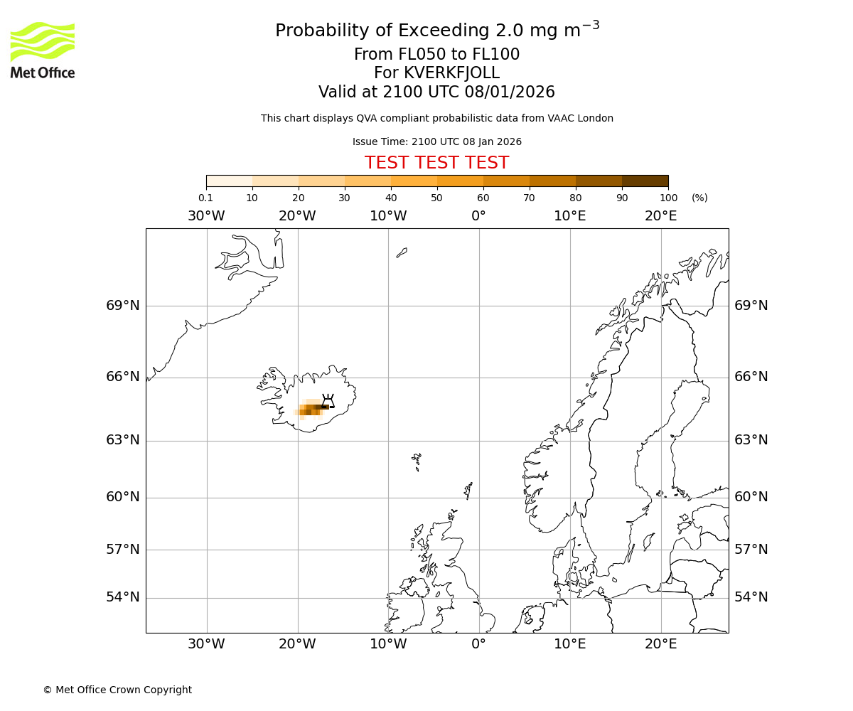 Probability of exceeding 2.0 milligrams per metre cubed. From 000 to 050 for KVERKFJOLL. Valid at 2100 UTC 08/01/2026