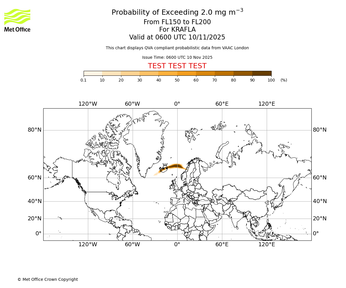 In accordance with ICAO Annex 3, Amendment 82 VAAC London will provide operational QVA forecasts from 27 November 2025 and these will be made available via a VAAC London QVA API information service. These charts are currently provided for test and evaluation purposes (not for operational use) until the introduction of the operational service.