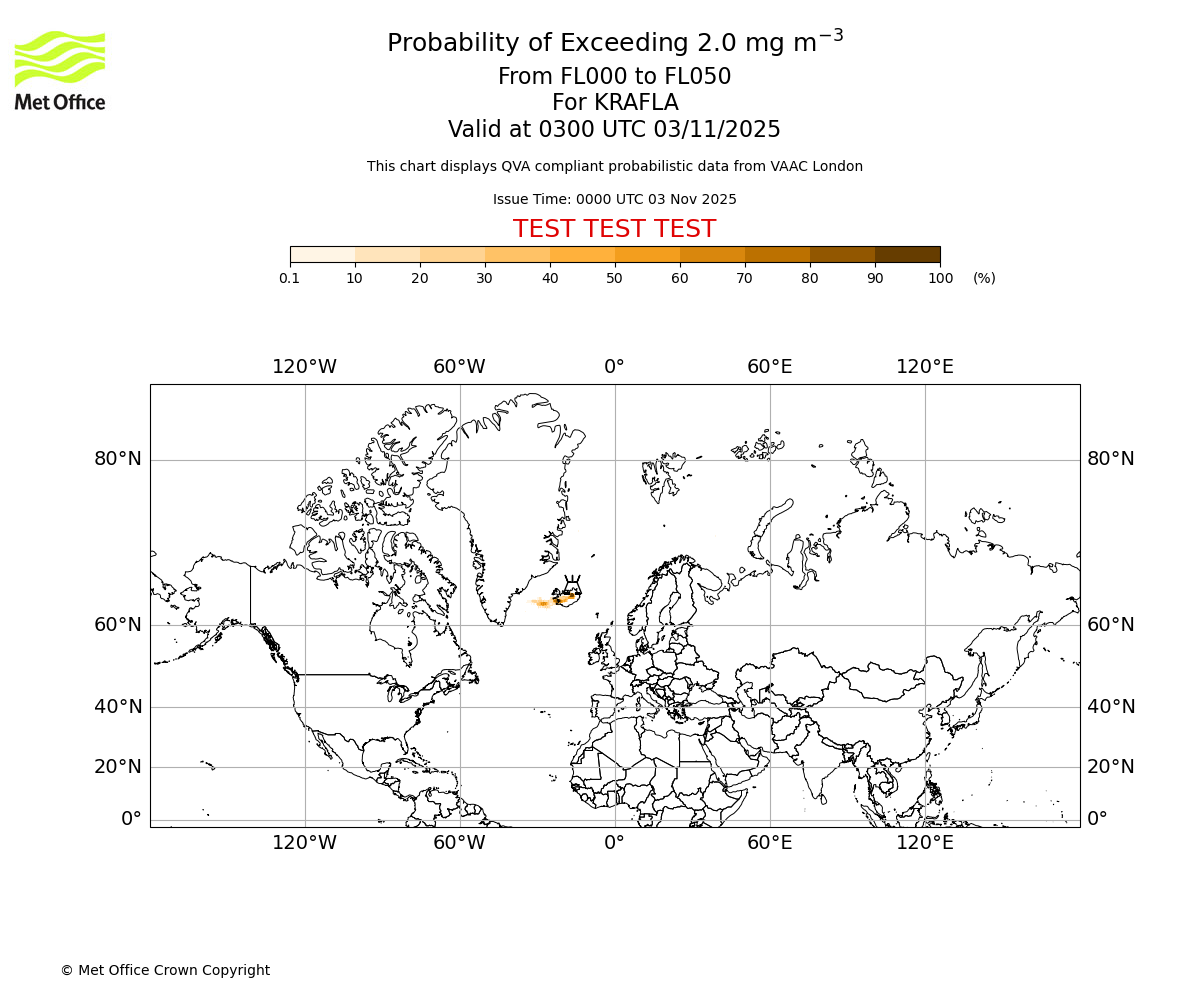 Probability of exceeding 2.0 milligrams per metre cubed. From 000 to 050 for KRAFLA. Valid at 0000 UTC 03/11/2025