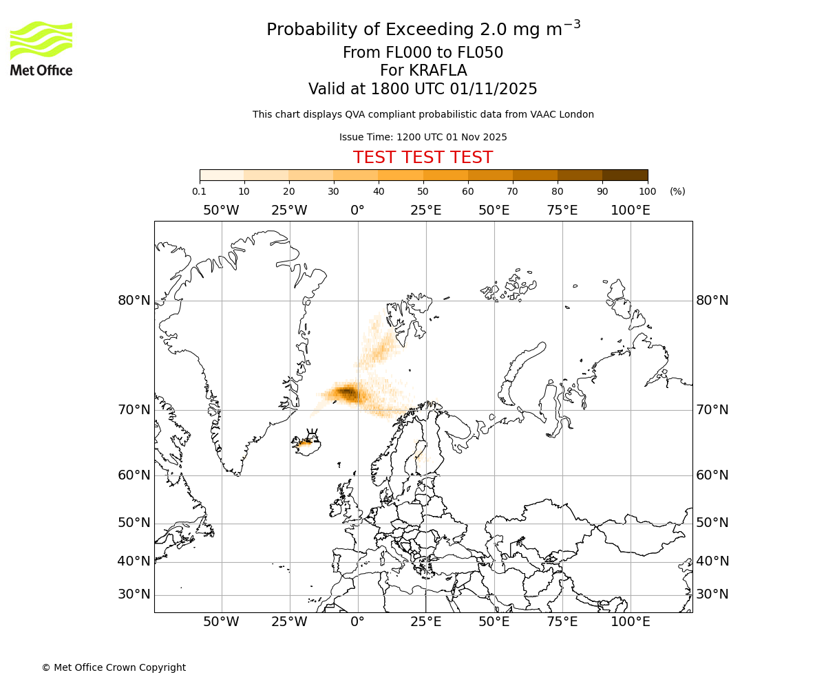 Modelled ash concentration from 000 to 050 for KRAFLA. Valid at 1200 UTC 01/11/2025