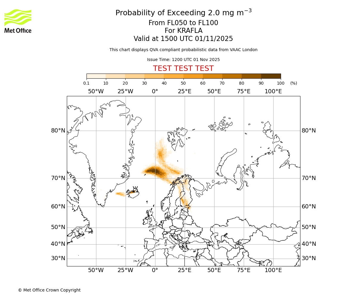 Probability of exceeding 2.0 milligrams per metre cubed. From 000 to 050 for KRAFLA. Valid at 1500 UTC 01/11/2025