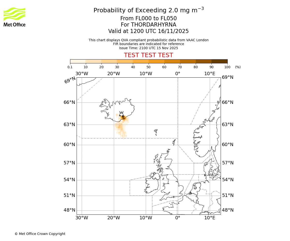 Probability of exceeding 2.0 milligrams per metre cubed. From 000 to 050 for THORDARHYRNA. Valid at 0900 UTC 16/11/2025