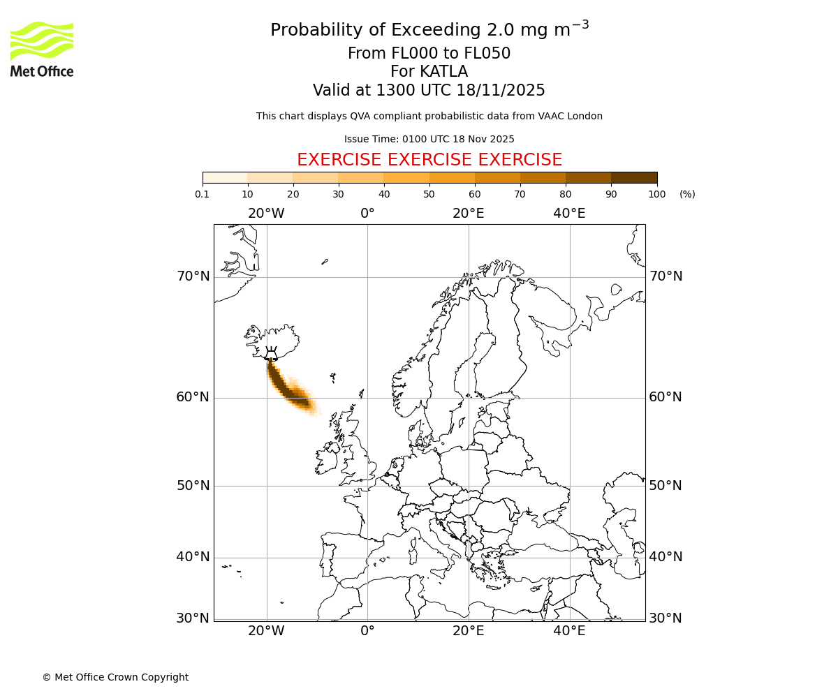 Modelled ash concentration from 000 to 200 for KATLA. Valid at 0100 UTC 18/11/2025