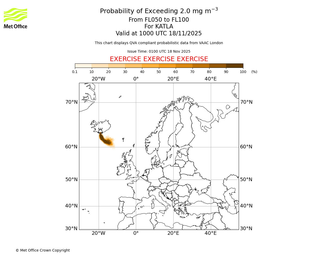 Probability of exceeding 2.0 milligrams per metre cubed. From 000 to 050 for KATLA. Valid at 1000 UTC 18/11/2025