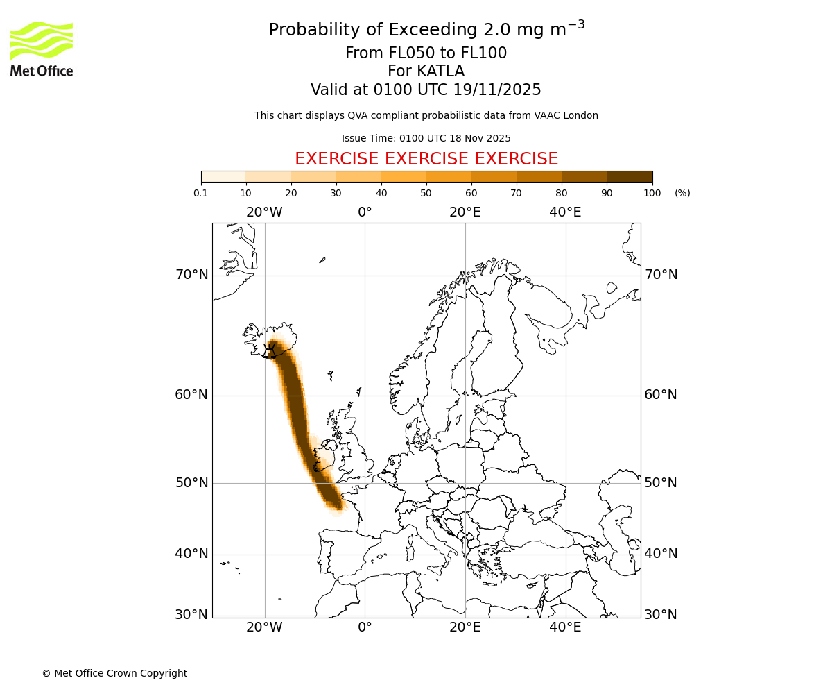 Probability of exceeding 2.0 milligrams per metre cubed. From 000 to 050 for KATLA. Valid at 0100 UTC 19/11/2025