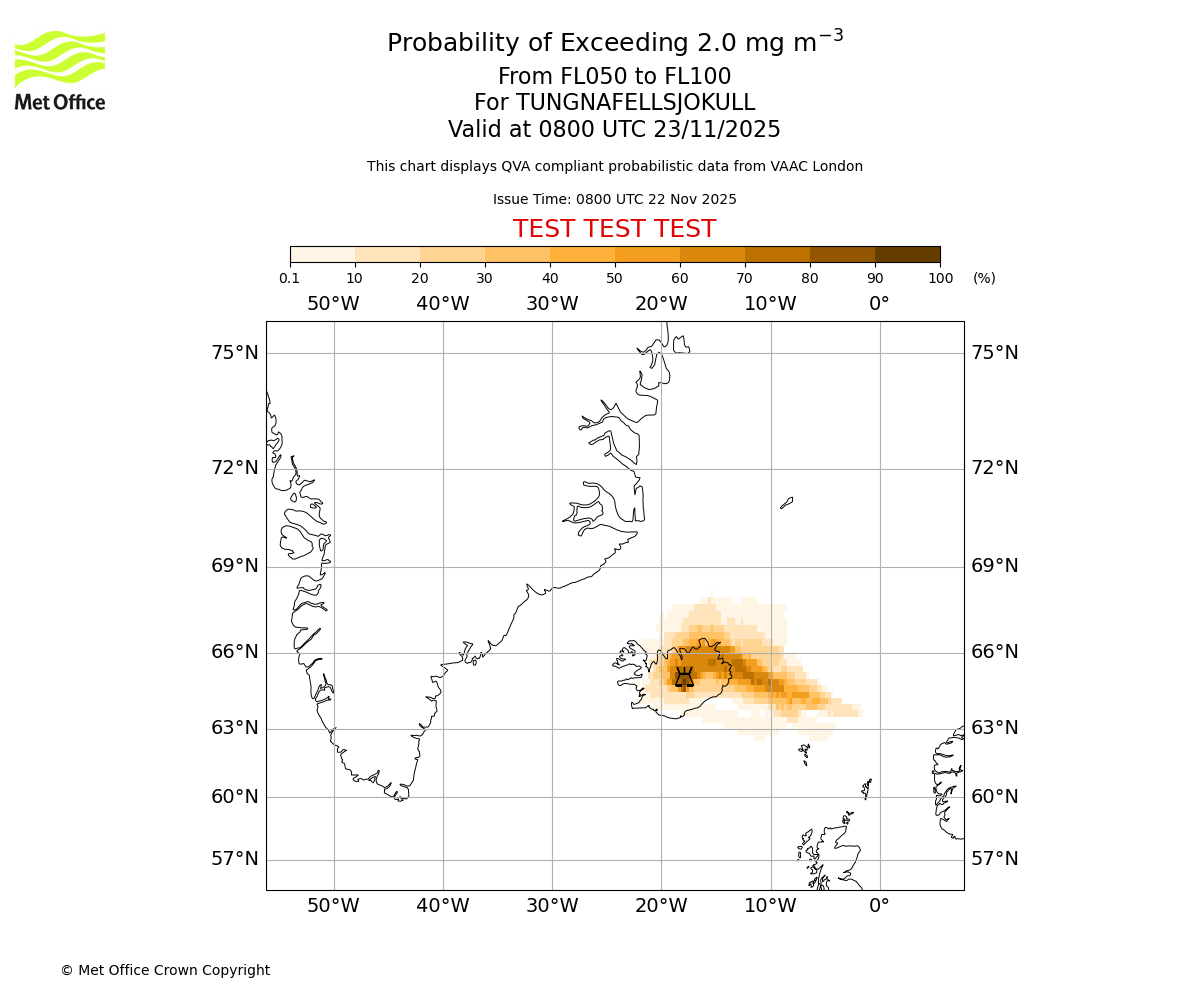 Probability of exceeding 2.0 milligrams per metre cubed. From 000 to 050 for TUNGNAFELLSJOKULL. Valid at 0800 UTC 23/11/2025