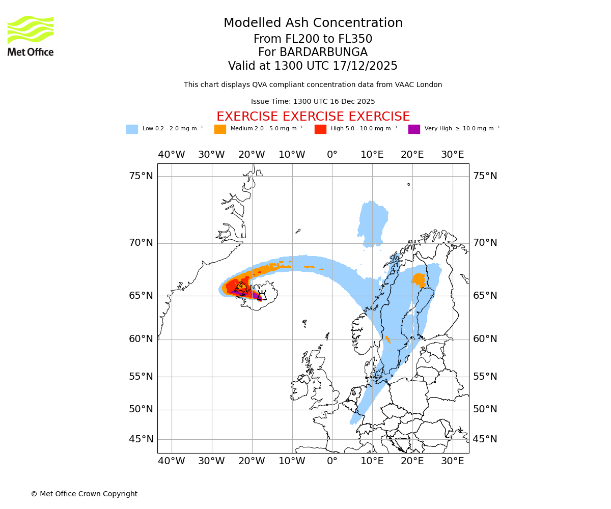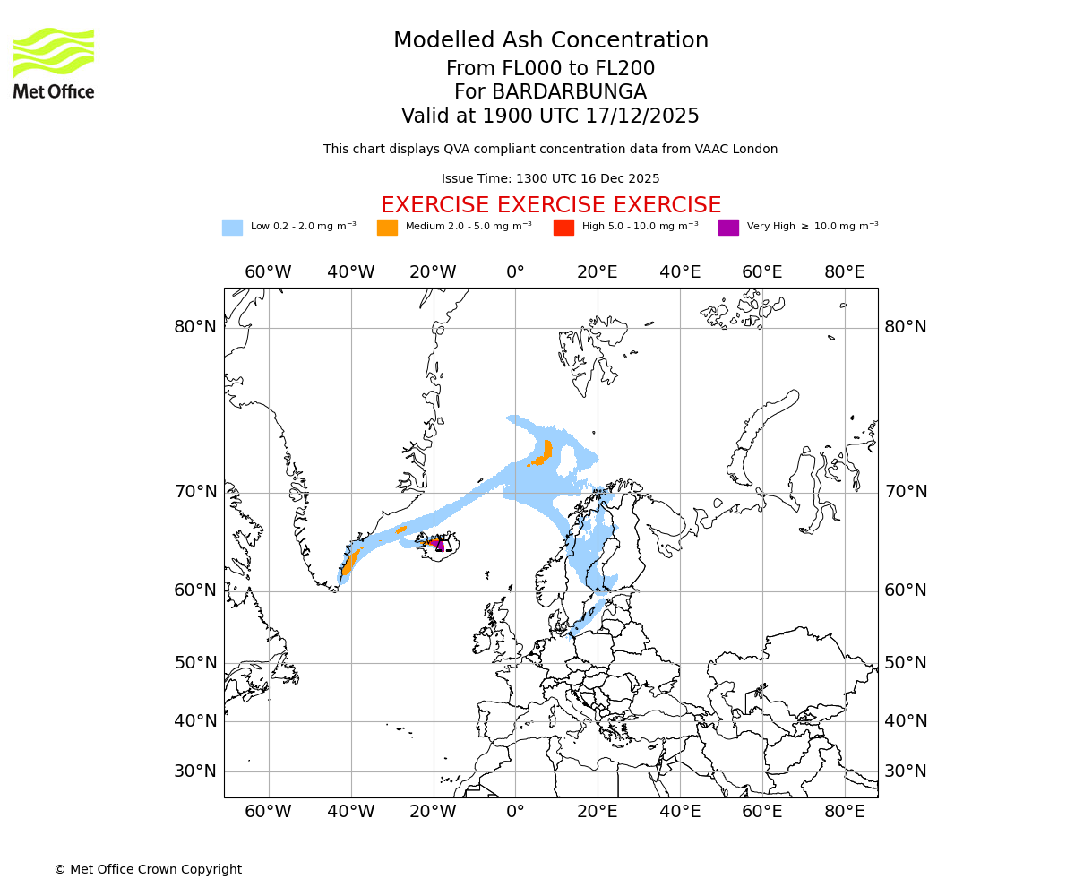 Modelled ash concentration from 000 to 200 for BARDARBUNGA. Valid at 1300 UTC 17/12/2025