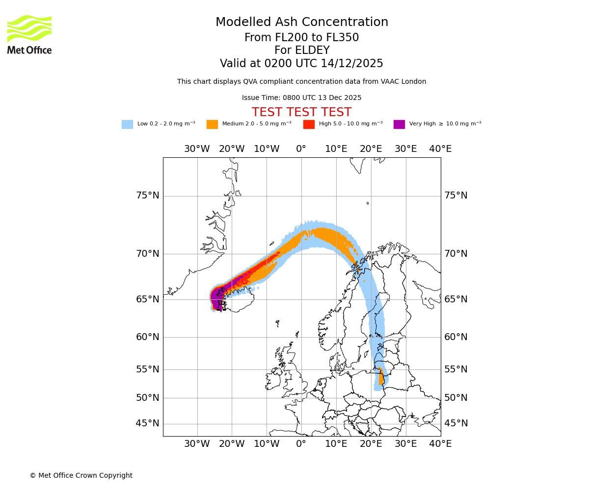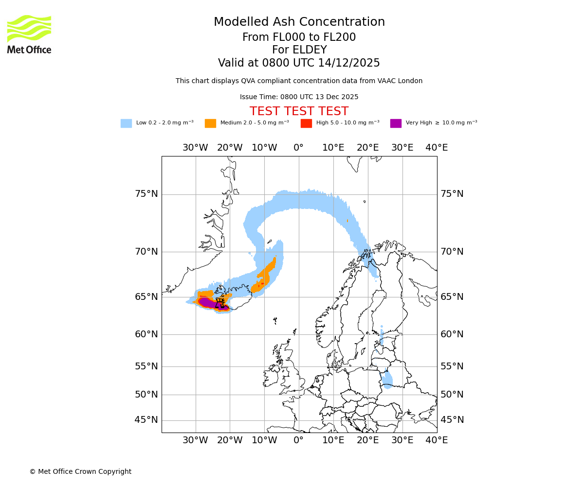 Modelled ash concentration from 000 to 200 for ELDEY. Valid at 0200 UTC 14/12/2025