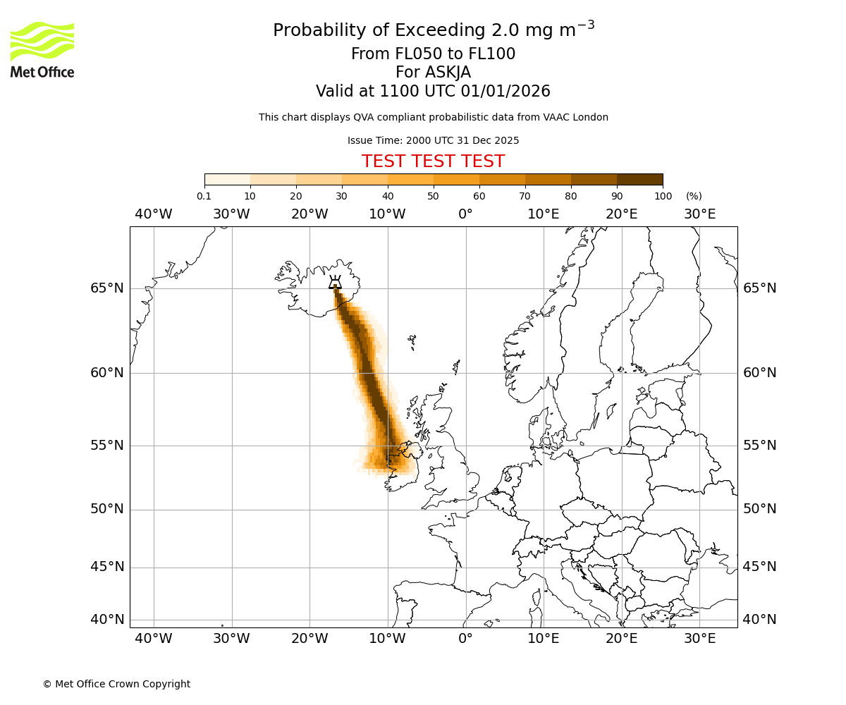 Probability of exceeding 2.0 milligrams per metre cubed. From 000 to 050 for ASKJA. Valid at 1100 UTC 01/01/2026