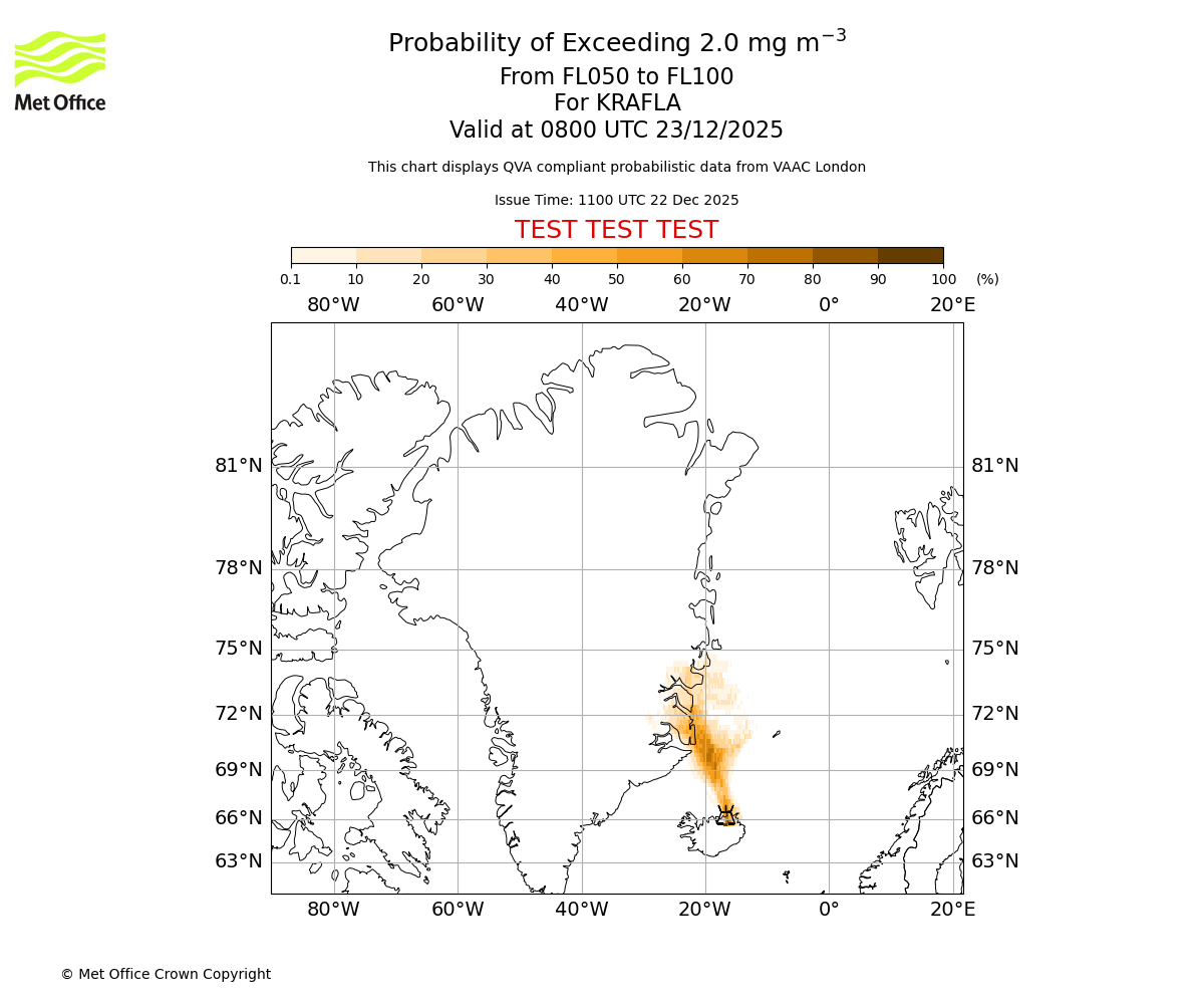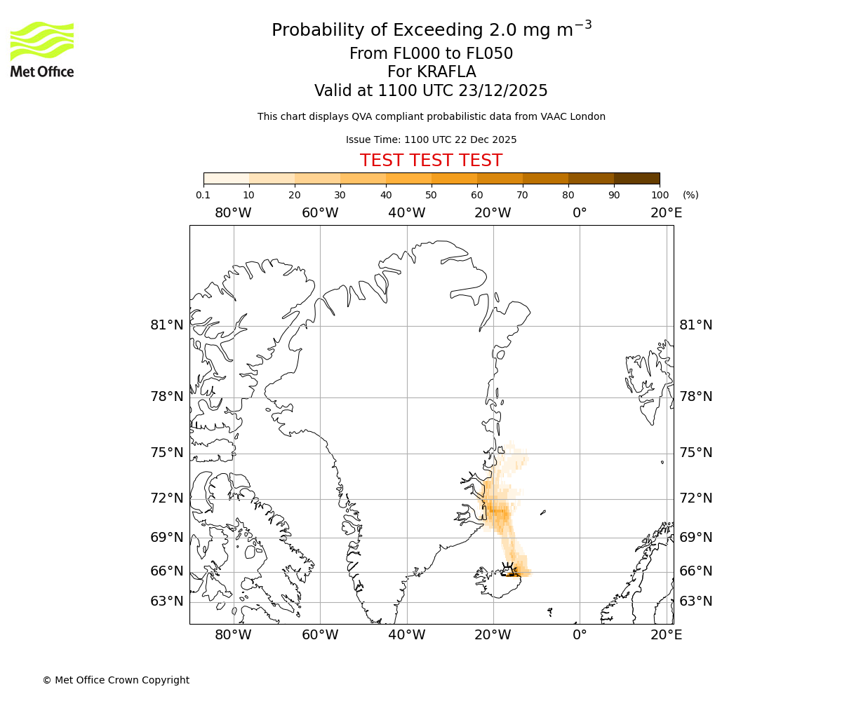 Probability of exceeding 2.0 milligrams per metre cubed. From 000 to 050 for KRAFLA. Valid at 0800 UTC 23/12/2025