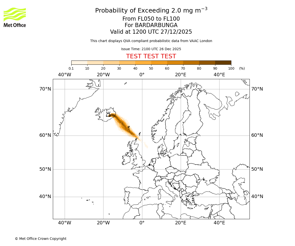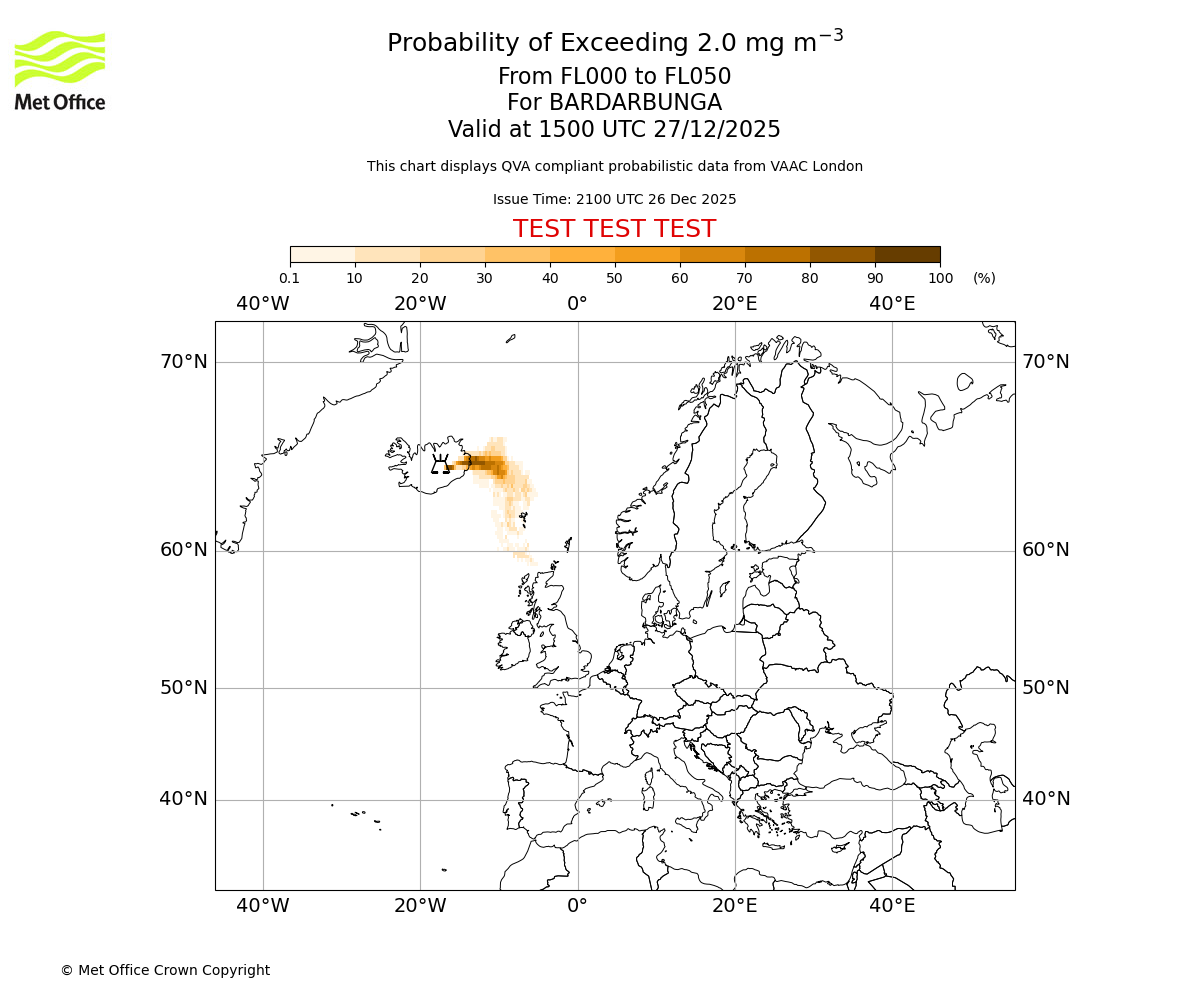 Probability of exceeding 2.0 milligrams per metre cubed. From 000 to 050 for BARDARBUNGA. Valid at 1200 UTC 27/12/2025