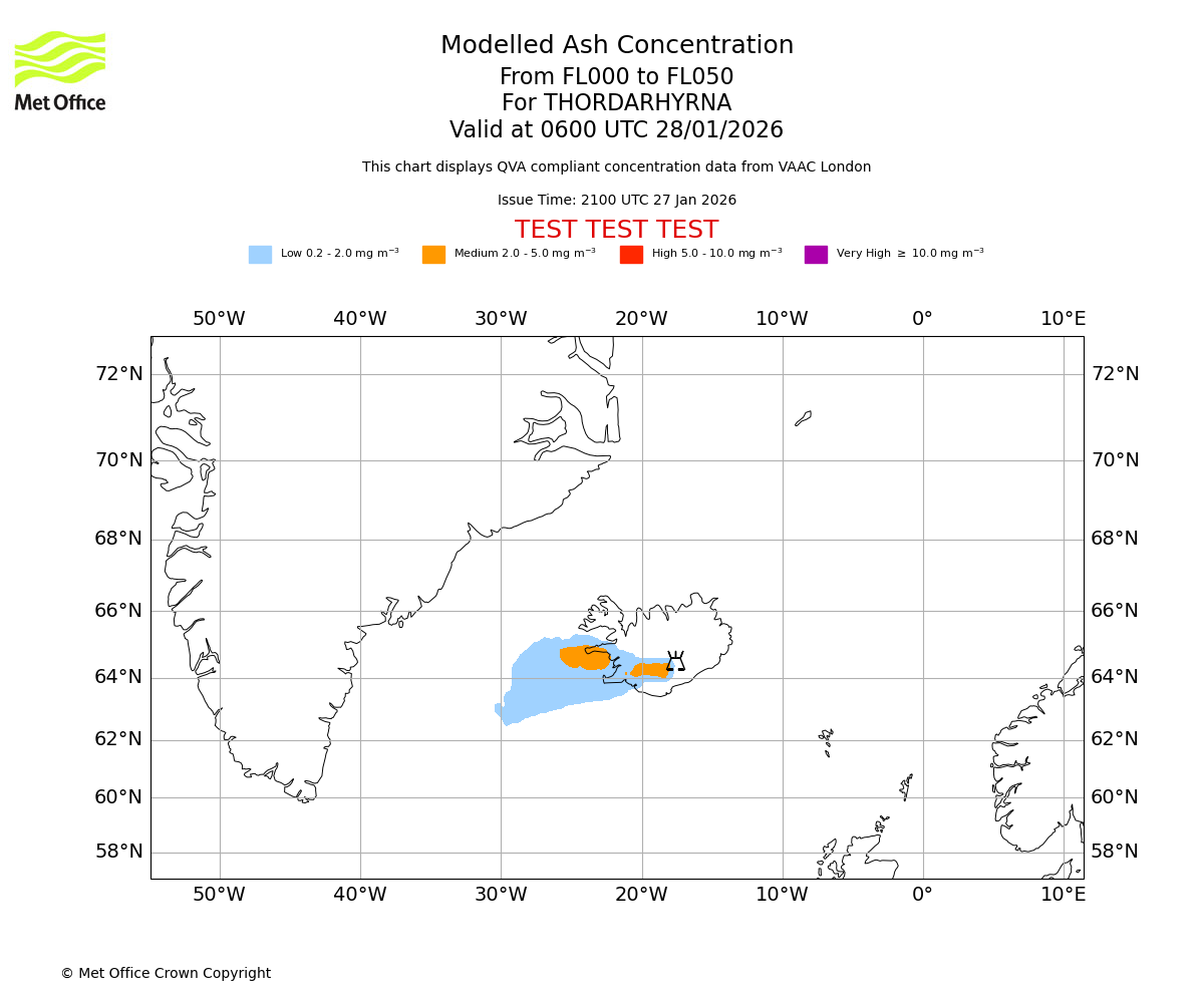 Modelled ash concentration from 000 to 050 for THORDARHYRNA. Valid at 0300 UTC 28/01/2026