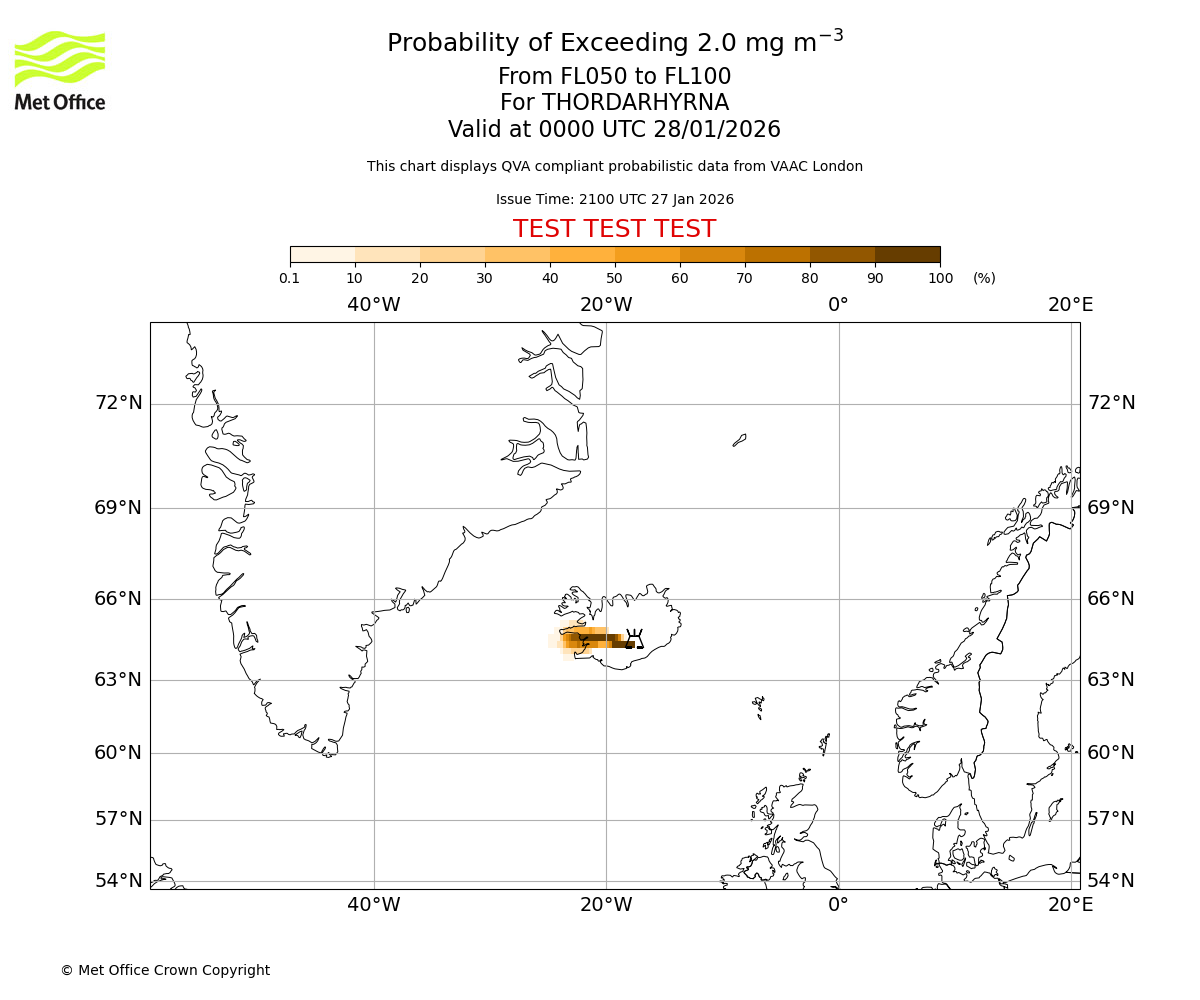 Probability of exceeding 2.0 milligrams per metre cubed. From 000 to 050 for THORDARHYRNA. Valid at 0000 UTC 28/01/2026