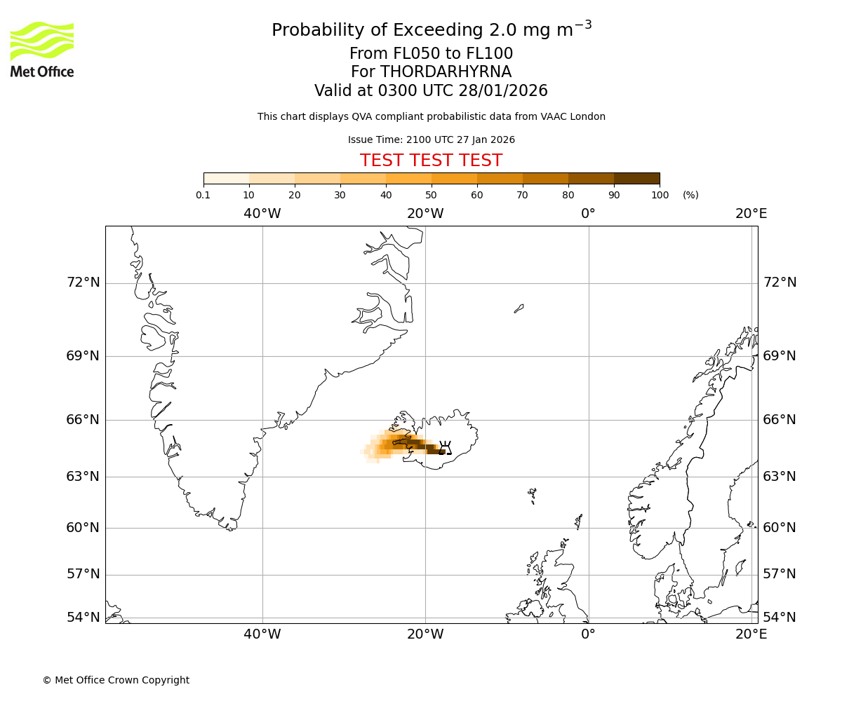 Probability of exceeding 2.0 milligrams per metre cubed. From 000 to 050 for THORDARHYRNA. Valid at 0300 UTC 28/01/2026