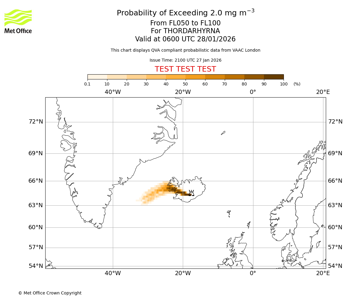 Probability of exceeding 2.0 milligrams per metre cubed. From 000 to 050 for THORDARHYRNA. Valid at 0600 UTC 28/01/2026