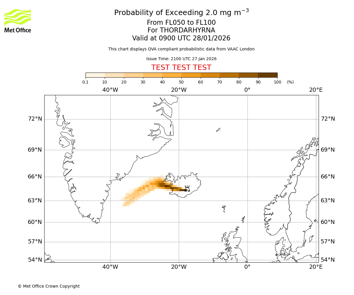Probability of exceeding 2.0 milligrams per metre cubed. From 000 to 050 for THORDARHYRNA. Valid at 0900 UTC 28/01/2026