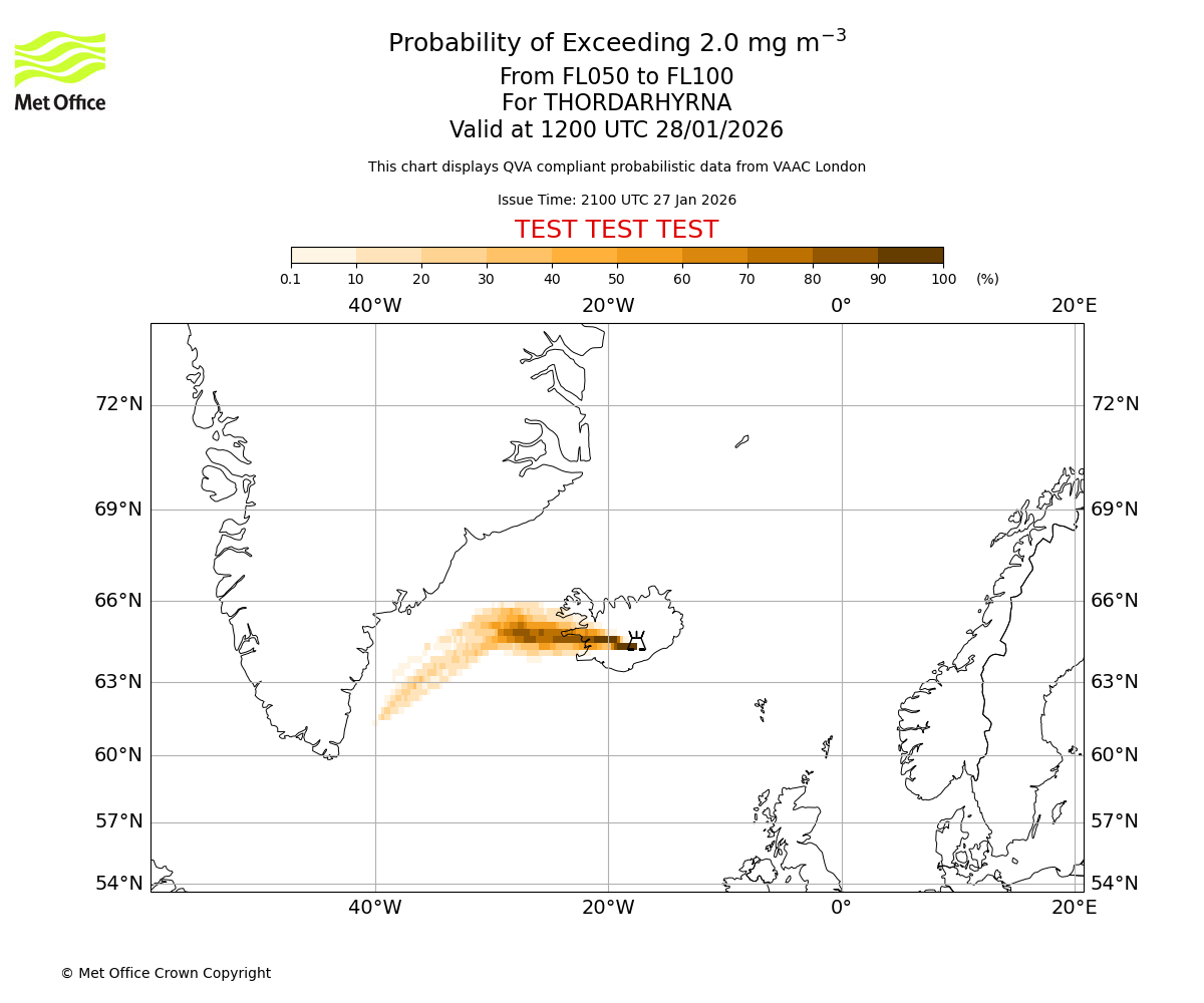 Probability of exceeding 2.0 milligrams per metre cubed. From 000 to 050 for THORDARHYRNA. Valid at 1200 UTC 28/01/2026
