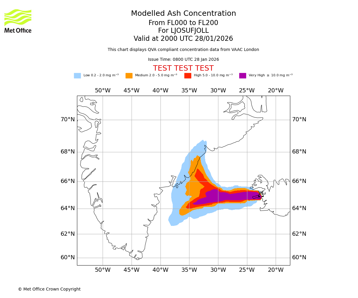 Modelled ash concentration from 000 to 200 for LJOSUFJOLL. Valid at 1400 UTC 28/01/2026