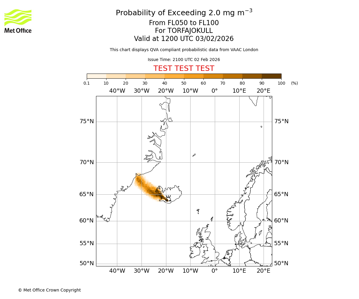Probability of exceeding 2.0 milligrams per metre cubed. From 000 to 050 for TORFAJOKULL. Valid at 1200 UTC 03/02/2026