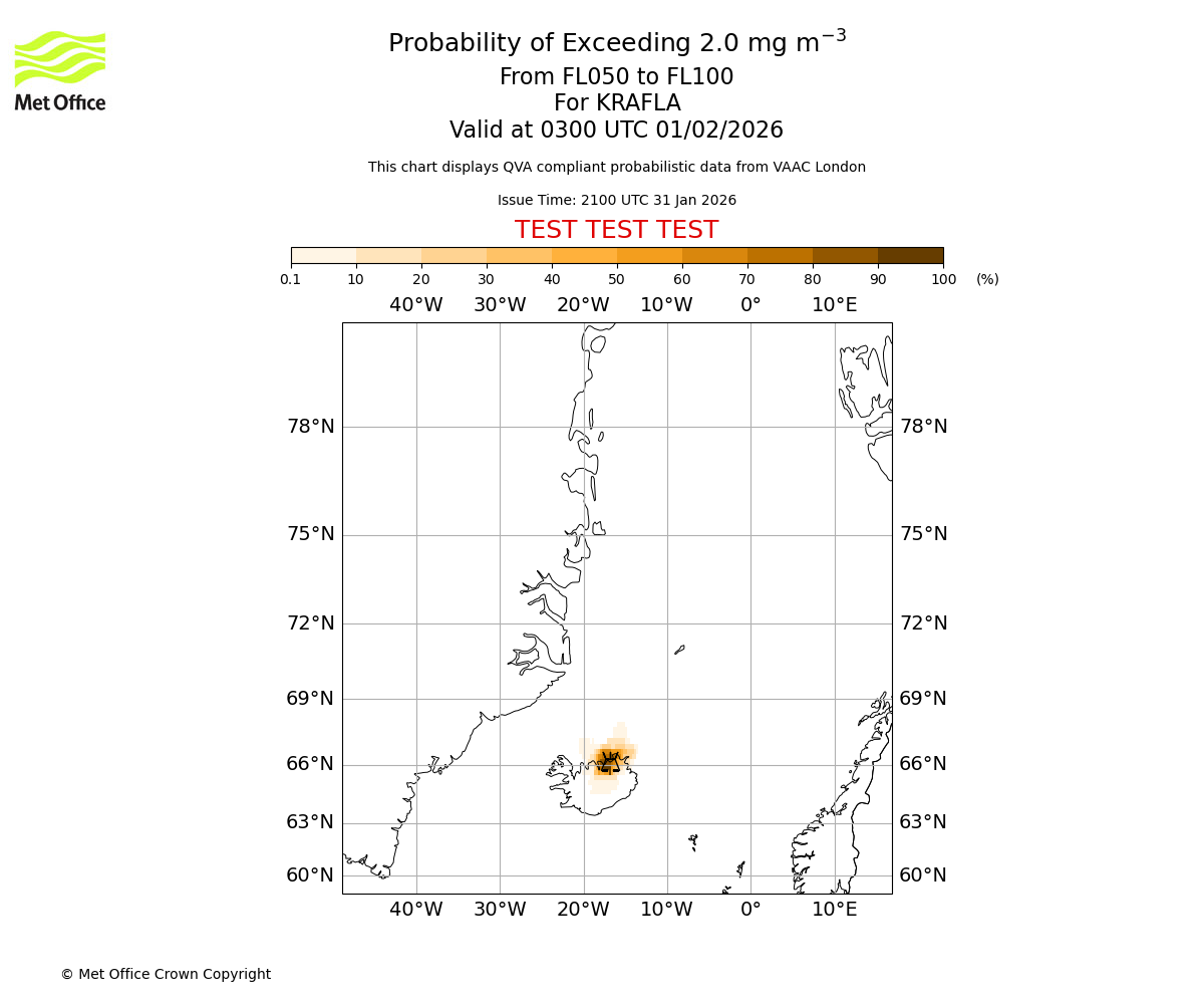 Probability of exceeding 2.0 milligrams per metre cubed. From 000 to 050 for KRAFLA. Valid at 0300 UTC 01/02/2026