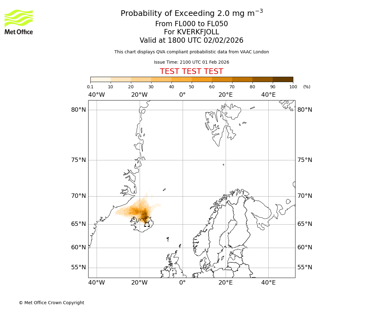 Modelled ash concentration from 000 to 050 for KVERKFJOLL. Valid at 0000 UTC 02/02/2026
