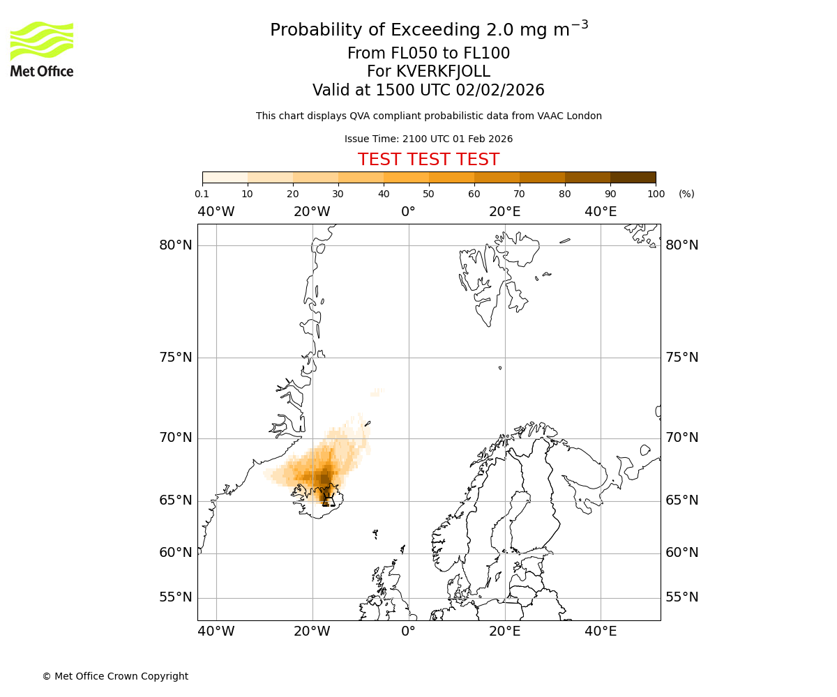 Modelled ash concentration from 000 to 200 for KVERKFJOLL. Valid at 2100 UTC 01/02/2026