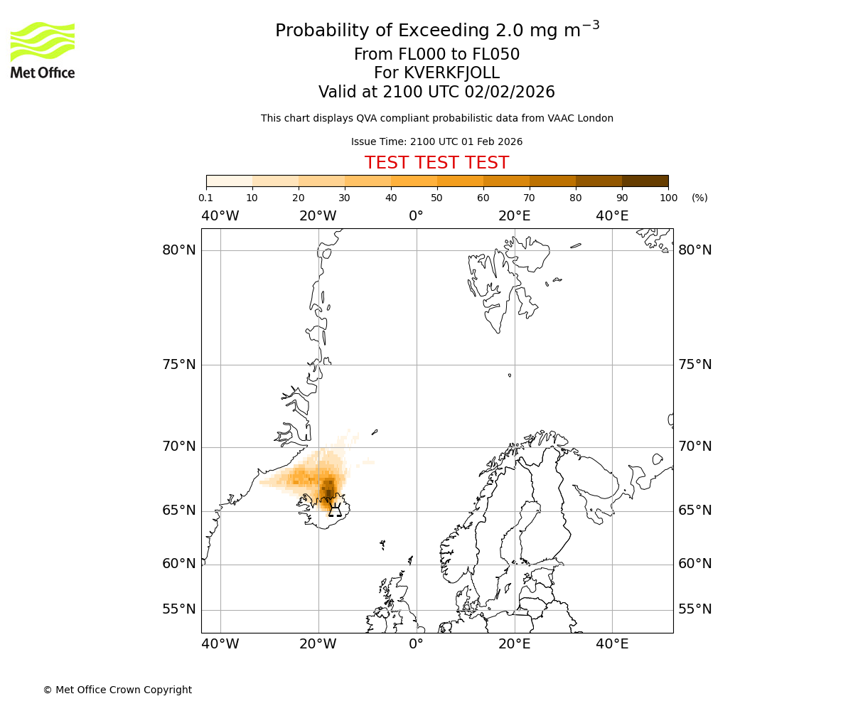 Modelled ash concentration from 000 to 200 for KVERKFJOLL. Valid at 2100 UTC 01/02/2026