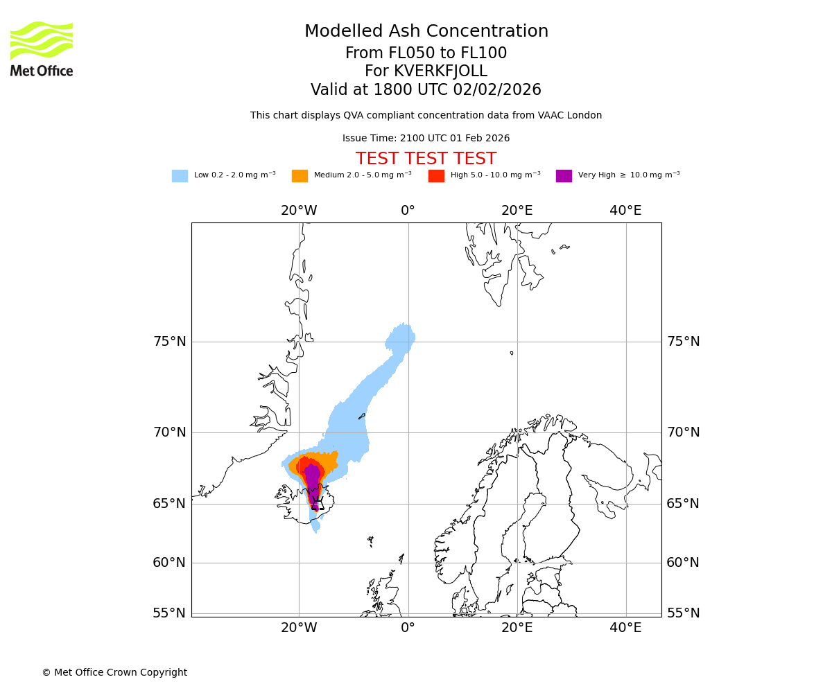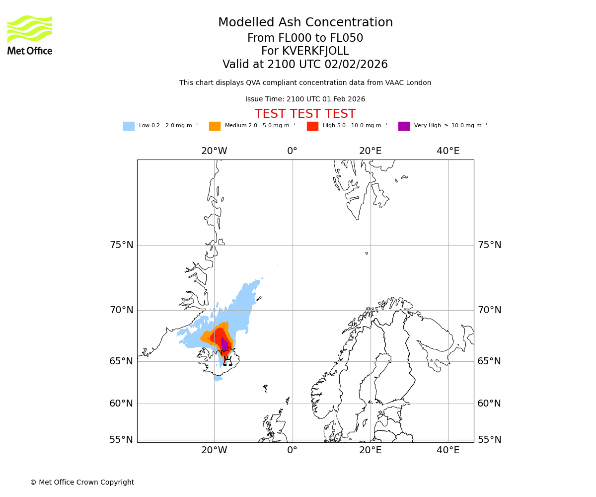 Modelled ash concentration from 000 to 050 for KVERKFJOLL. Valid at 1800 UTC 02/02/2026