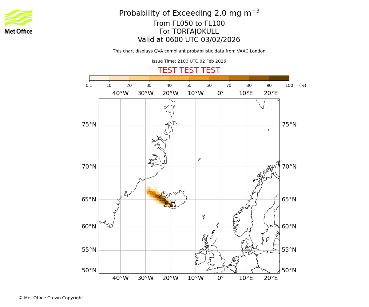 Probability of exceeding 2.0 milligrams per metre cubed. From 000 to 050 for TORFAJOKULL. Valid at 0600 UTC 03/02/2026