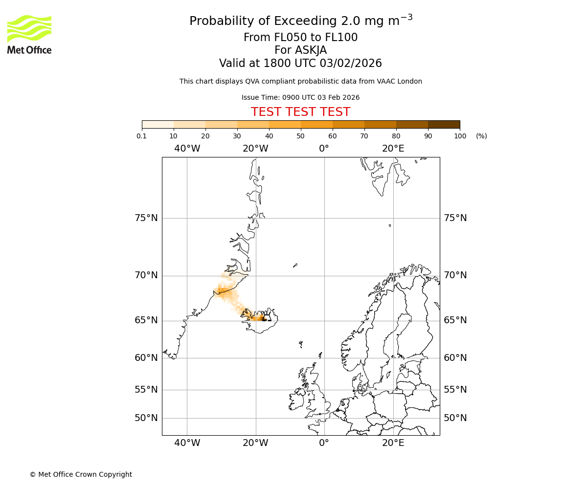 Probability of exceeding 2.0 milligrams per metre cubed. From 000 to 050 for ASKJA. Valid at 1800 UTC 03/02/2026