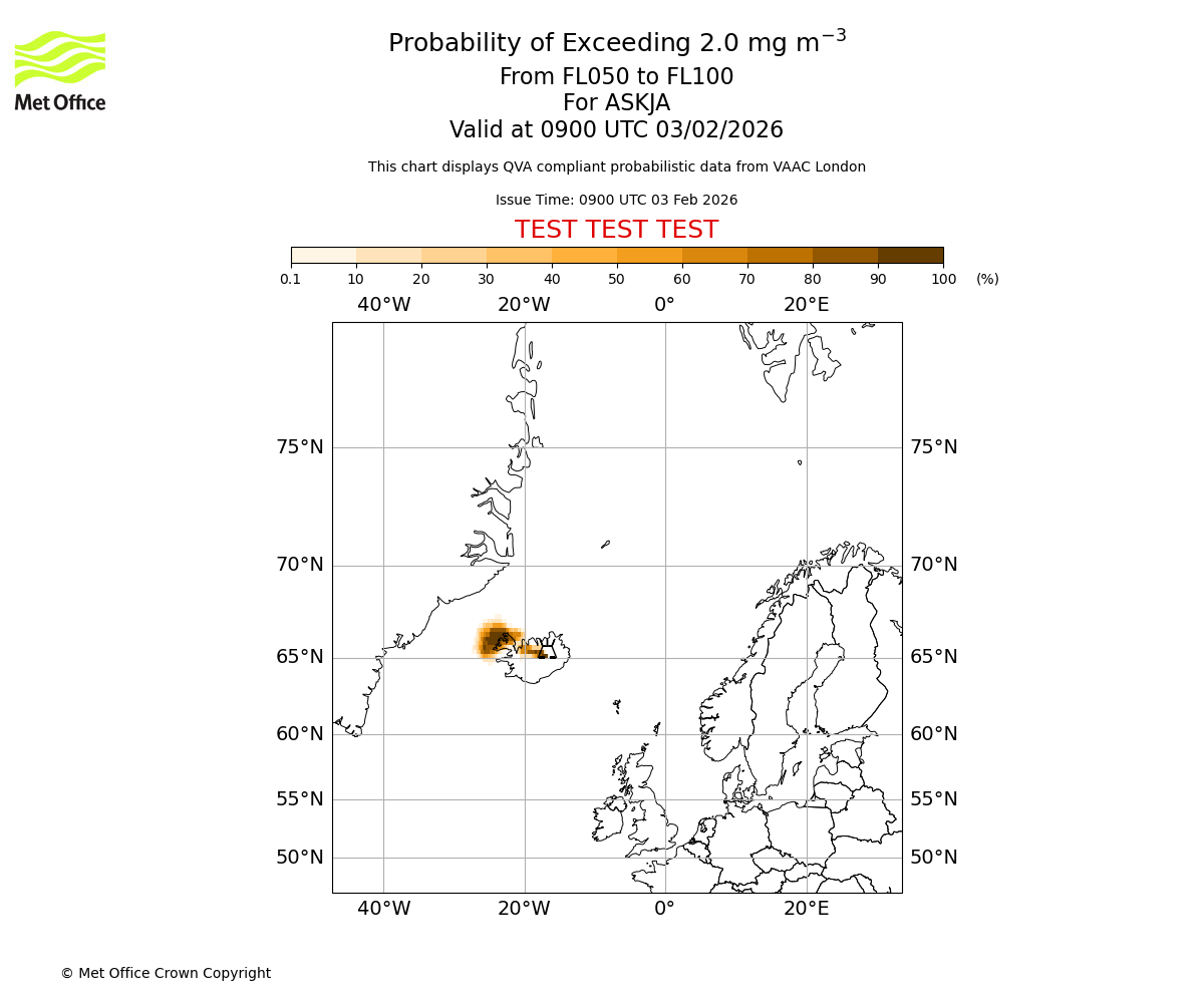 Probability of exceeding 2.0 milligrams per metre cubed. From 000 to 050 for ASKJA. Valid at 0900 UTC 03/02/2026