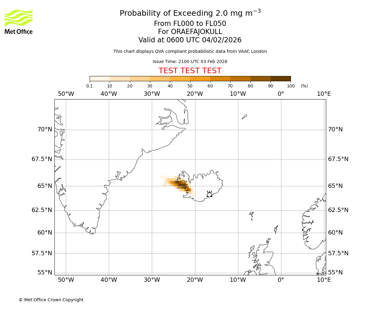 Modelled ash concentration from 000 to 200 for ORAEFAJOKULL. Valid at 2100 UTC 03/02/2026