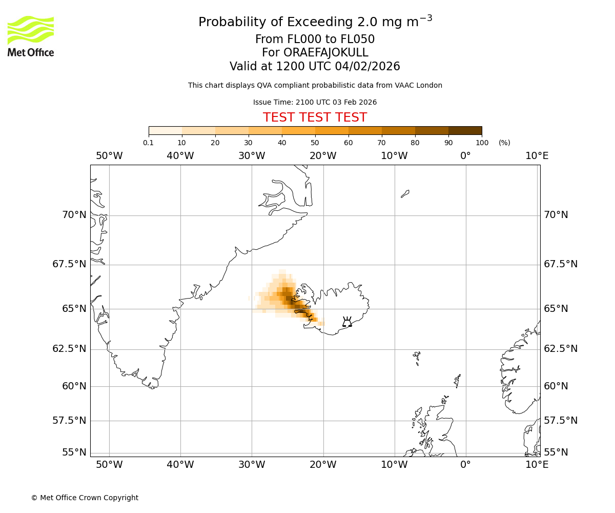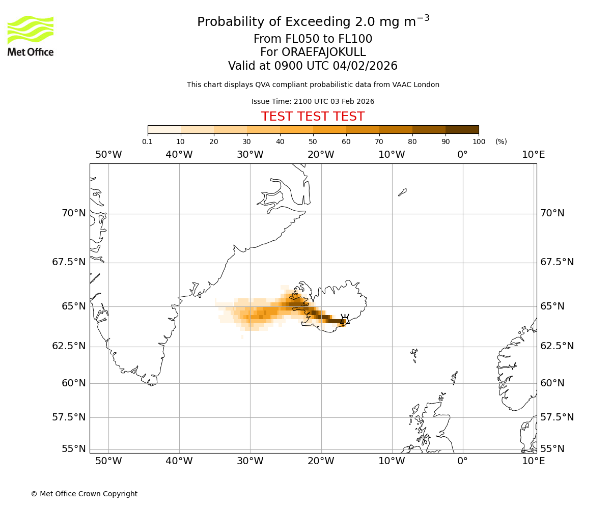 Probability of exceeding 2.0 milligrams per metre cubed. From 000 to 050 for ORAEFAJOKULL. Valid at 0900 UTC 04/02/2026