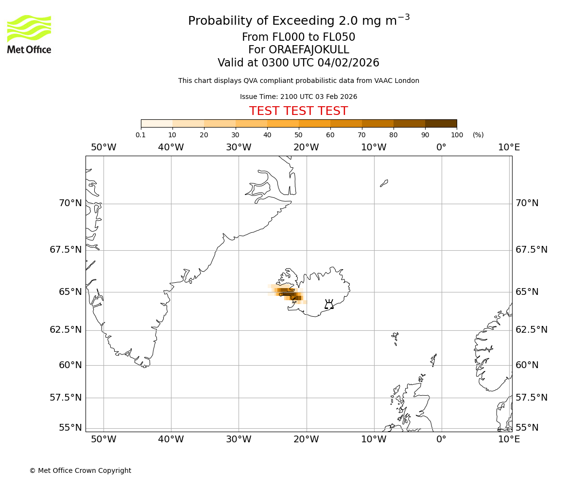 Modelled ash concentration from 000 to 050 for ORAEFAJOKULL. Valid at 0300 UTC 04/02/2026