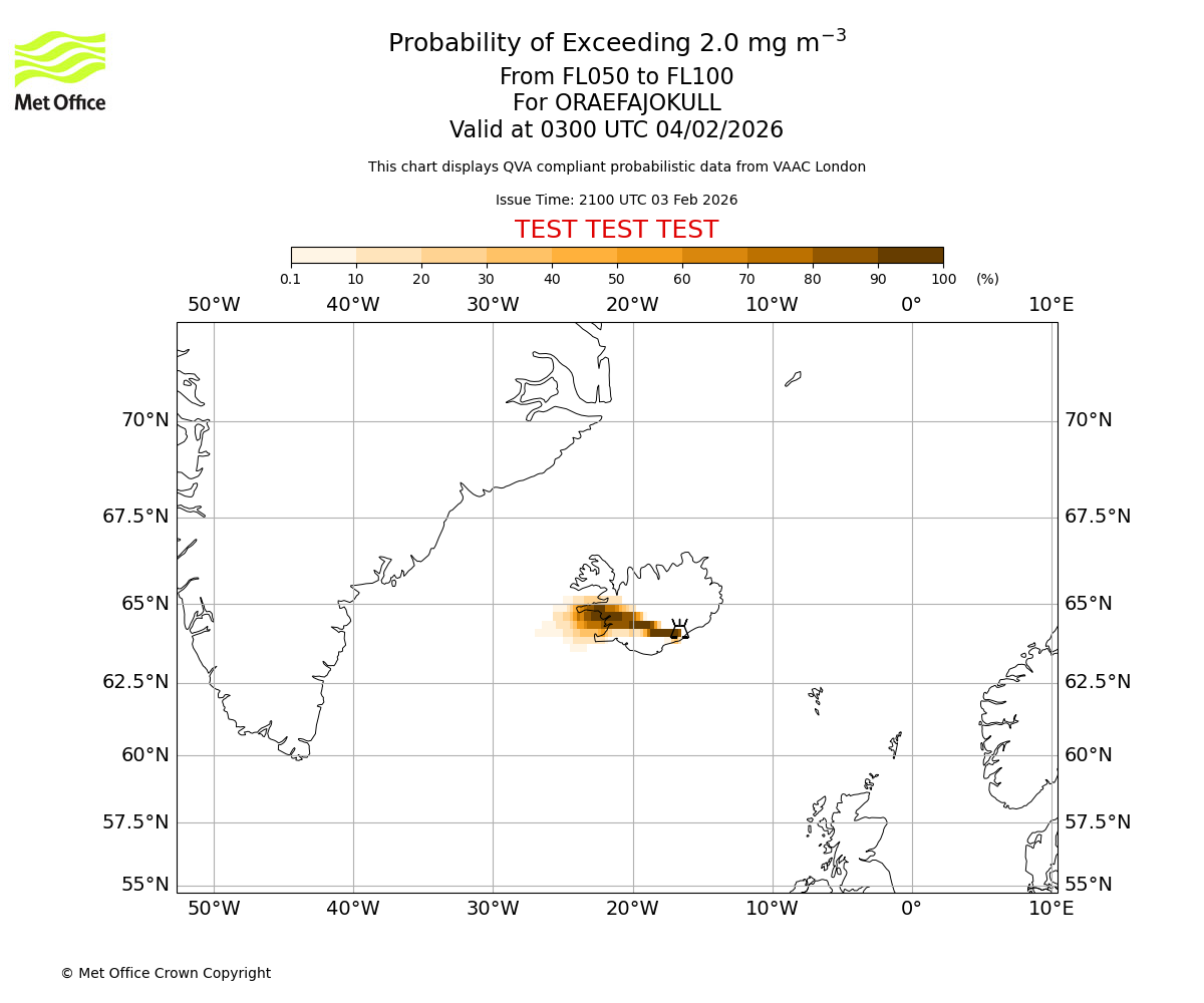 Probability of exceeding 2.0 milligrams per metre cubed. From 000 to 050 for ORAEFAJOKULL. Valid at 0300 UTC 04/02/2026