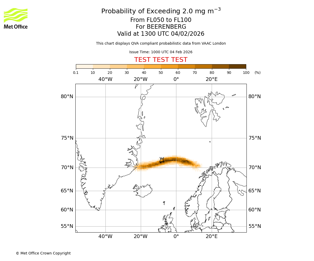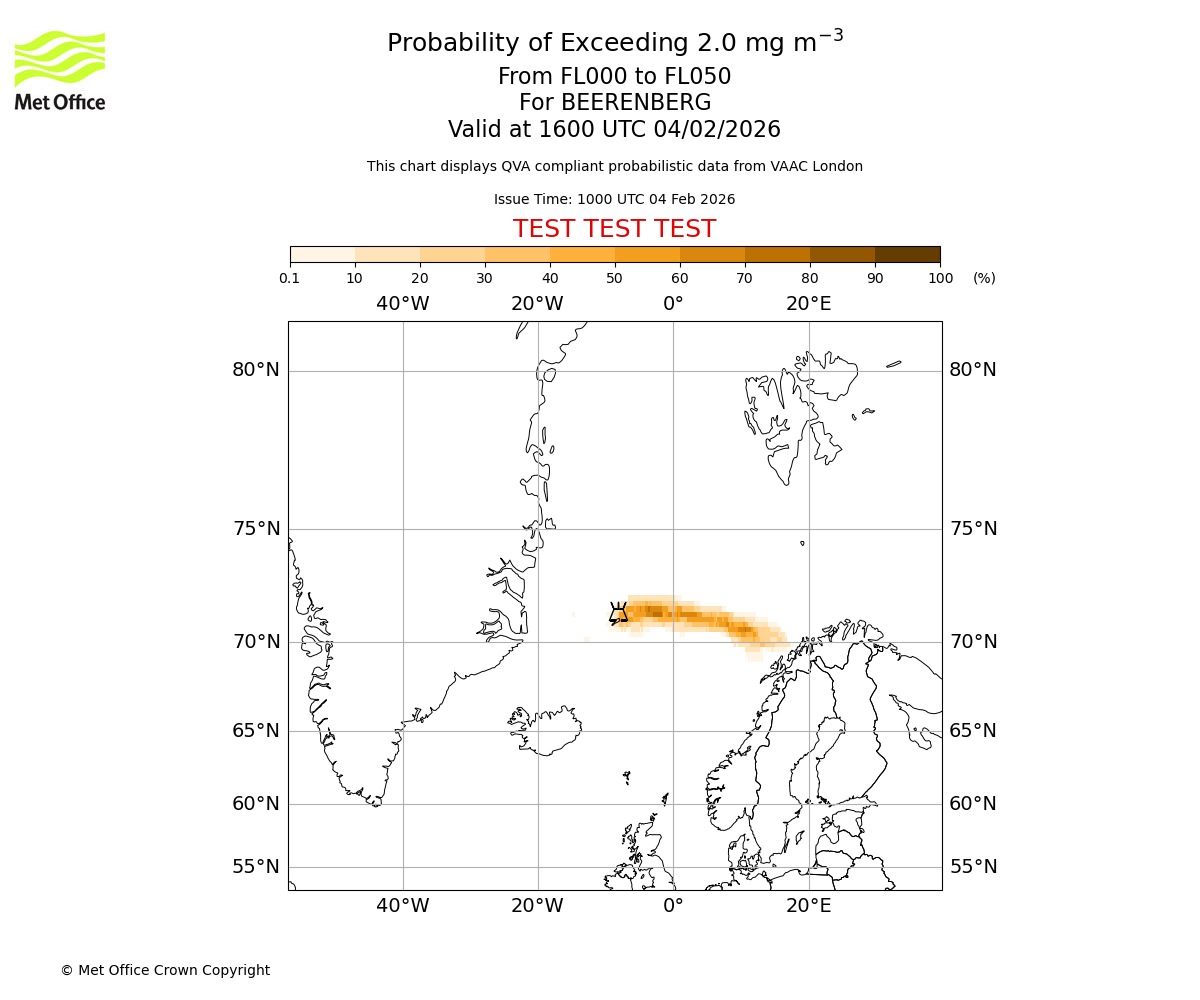 Modelled ash concentration from 000 to 050 for BEERENBERG. Valid at 1000 UTC 04/02/2026