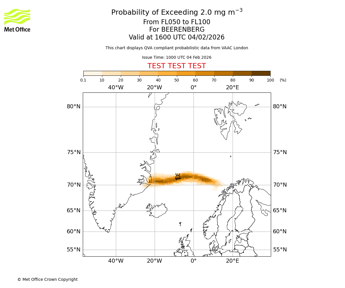 Modelled ash concentration from 000 to 200 for BEERENBERG. Valid at 1000 UTC 04/02/2026