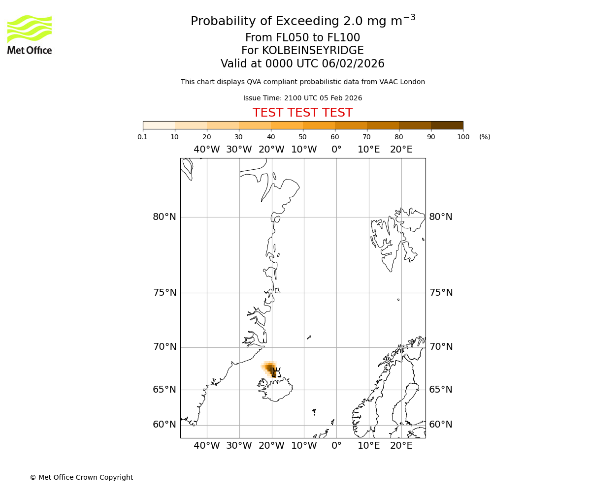 Probability of exceeding 2.0 milligrams per metre cubed. From 000 to 050 for KOLBEINSEYRIDGE. Valid at 0000 UTC 06/02/2026